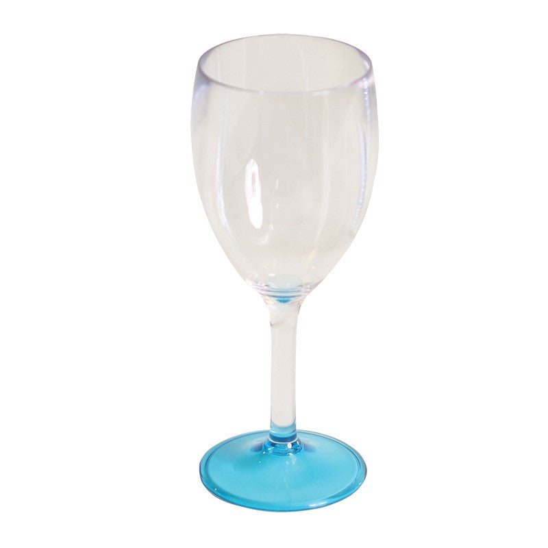 Quest Elegance Range Wine Glass with Transparent Blue Colour Base A high quality acryclic glass with a touch of class. A premium quality acrylic glass that has the touch and feel of real glass without the fragility of glass. Smooth lines and a transparent blue colour base make this an eye catching glass that will last for years. Thanks to the durability and lightweight nature of this drinkware it is ideal for camping, travelling or any outdoor use.