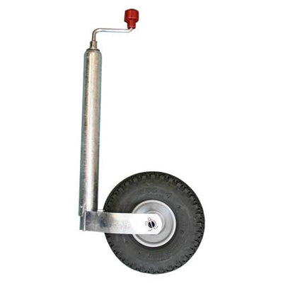 • The jockey wheel plus with an outer pipe diameter of 48 mm can be used for nose loads up to a maximum of 200 kg while stationary and 120 kg in manoeuvring operation. the crank with installed thrust block ensures easy operation. • Fits forjockey wheel carrier, diameter 48 mm • Crank with thrust block for easier operation • Extended version • Steel rim • High-quality corrosion protection thanks to hot-dip galvanizing • 260x85mm air filled wheel Call Us Email Us