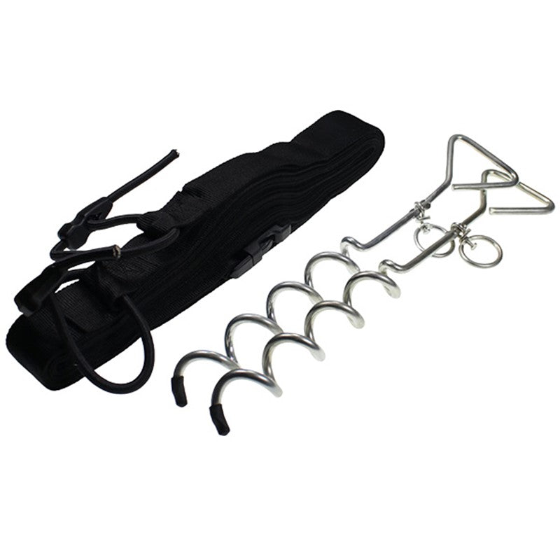 W4 awning tie down kit. durable nylon buckle which is easy to fit and quick to release. dual elasticated cord tensioners - for easy adjustment. secure tethering with 2 land anchors. 10.8m of high tensile strapping