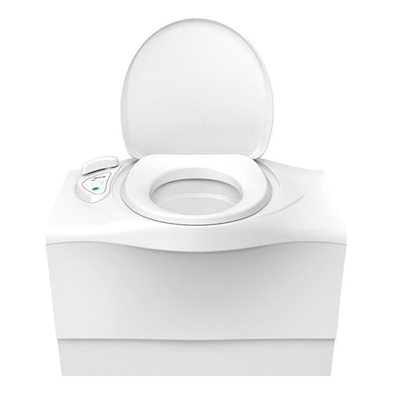 The built-in cassette toilet consists of two parts: a permanently installed toilet and a removable waste holding tank.