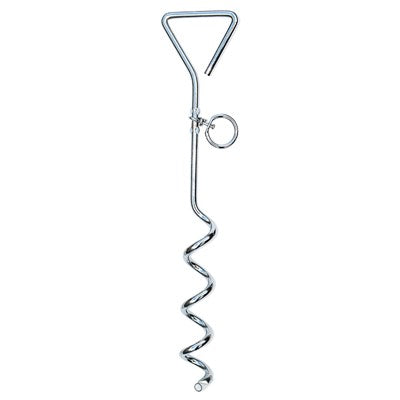 A high quality solid steel spiral screw. Easy to use and provides you with a secure staking point that you can tie your dog to whether you are out having a picnic or even in your own garden. Complete with attached, twistable oring that allows anything attached full 360 degree movement around the peg.