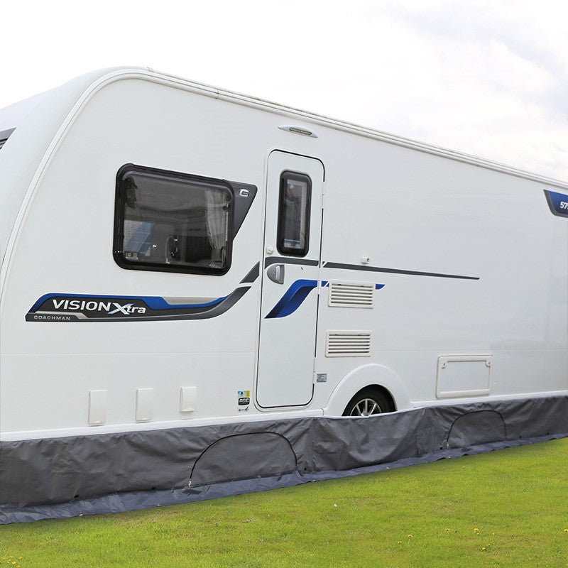 The draught skirt features standard caravan channel beading across the top of the draft skirt enabling it to be threaded into a standard caravan channel. The fabric is a premium dual layered fabric with a weather proof, easy clean PVC backing and a soift touch 'cotton style' front giving you the best of both worlds. It has eyelets across the bottom allowing it to be pegging securely into the ground giving an even better protection against draughts. The draught skirt also comes with its own handy storage bag making it easier to carry and store away when not in use.