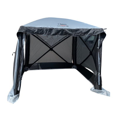 Quest Screen House 4 Pro This is the Pro version of the best selling Screen House 4. It is still the simplest, quickest, easiest and best gazebo on the market. It has 4 sides and is built and designed so one person can erect (or take it down) in less than one minute. There is nothing to put together or assemble, you simply take it out of the, place it on the floor and open it out. Once opened out simply walk around the screen house pulling each side towards you which pops the side into place, then walk inside and push the roof up. The screen house is then erected and ready to be pegged, there are two additional poles which go into the doorway and this just to give the doorway extra rigidity when open. We always recommend using the door poles and pegging the screen house down using the pegging points and most importantly the storm straps (all included) as this ensures the screen house is secured to the ground and that the sides cannot be blown in by the wind. The Screen House Pro has the same built in, premium Quest No-Chill mesh panels all around, including over the doorway as the standard screen house. This enables you to have a full insect screen all around, but still allows you full 360 degree views from all around. The mesh allows air flow in and out of the screen house, which ensures it is safe to cook under (naked flames and heat sources must be kept away from the sides at all times) as you have full air flow. Whilst the mesh allows air flow it does stop the wind chill. This works by allowing the air through the mesh, but it breaks the wind up as the air passes through the mesh and this removes that wind chill factor, perfect when you just want to sit out of the wind, but still want uninterrupted views all around. The roof is waterproof and taped (the mesh sides are not) and UV coated to give you 50+ uv rating to help protect you and the screen house itself from the suns harmful rays. This helps ensure that on a hot day you get an excellent amount of shade and protection. This combined with the mesh sides is why the screen house works so well all year round. It is warmer in the wind and cooler in the sun, whilst allowing great views all the time. The Screen House Pro then has additional zip down full sides with windows. So on top of the mesh sides you get additional full cover sides that can simply be zipped down to close and give extra weather protection and privacy, or up to allow full views and access to the mesh panels. The full sides also have a window in the top of them with an external blind allowing you to close the side, but still have a window open to allow light and the views in. It uses the latest generation premium hub system which has been improved on again making it smaller, lighter and more durable, whilst maintaining its ease of use and ability to be repaired if required. The premium hub system has been improved over the last 5 years to produce the best balance between weight, performance, and maintenance. When we use our own screen house as demos we typically use them for 2-3 years. In this time they are used at countless shows and at each one of these shows it is used for demos all day, every day. So each of our samples goes through approximately 10-15 years worth of wear and tear every year, and we use them for 2-3 years which gives us and yourselves the confidence that the premium hub system is extremely durable and will last for years. The Screen House 4 Pro also features the new accessory zip. This is a full zip that runs around the entire front of the screen house allowing for additional accessories to be attached to extend the features of your screen house. These accessories include a full canopy which gives you a large covered external space to the front of the screen house for extra weather protection. A vehicle connector which allows you to connect your Screen House 4 Pro directory to a low motor home / camper van (will fit between 180 - 210 in height), which turns your screen house into a fully fledged drive away awning. Also the Screen Shield which is a 180cm high extendable windbreak that can be zipped onto the front of you screen hose to give you a fully protected area to the front of your screen house. The screen house is also tested to wind force 7 speed. This is tested in a controlled wind tunnel environment to ensure that the screen house is excellent in windy conditions. Whilst the screen house is tested up to wind force 7, these are in a controlled environment and thus not representative of gale force winds outdoors. Due to peg movement, wind direction change and gusting and other external influences, like the type of ground it is pegged into, how well it has been pegged out, how tight (or over tight) the storm straps are it is impossible to replicate this in a controlled environment, so it is always recommended to drop the screen house down in gale force or harsh weather. Call Us Email Us