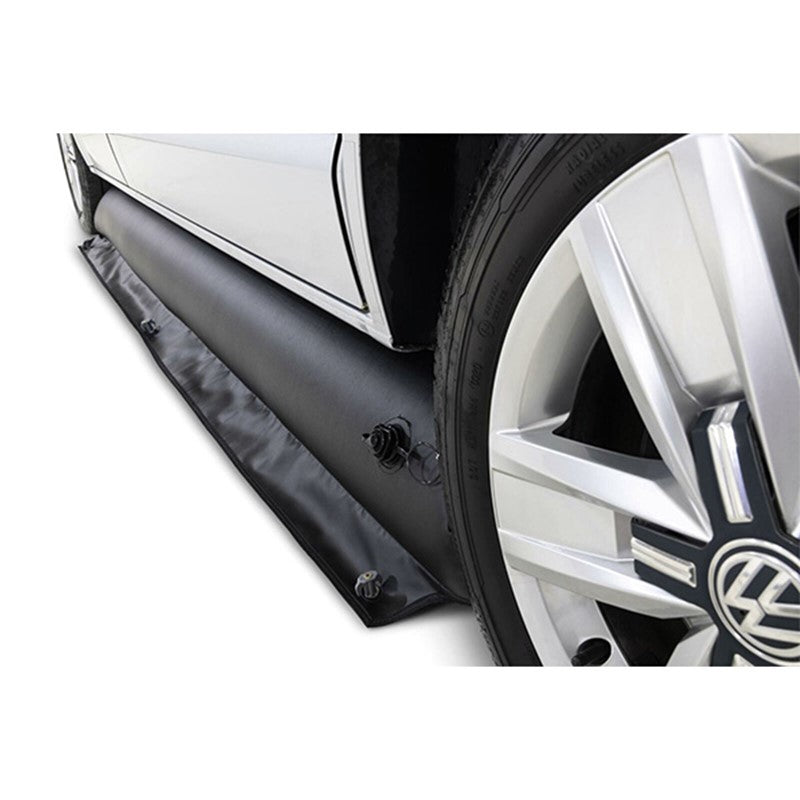 Inflatabledraft skirt for campervans. Made to go under your camper van or motorhome (between the front and rear wheels). Simply put in place and inflate. It then fills the gap to stop drafts from coming under the van. It is also useful for keeping pets and the like inside your drive away awning. Maximum length is 270 cm and 40 cm high, but can be used in smaller places as the draft skirt will just inflate to fill the gap. The heavy duty PVC material is punture resistant, hard wearing, easy to clean and quick drying.