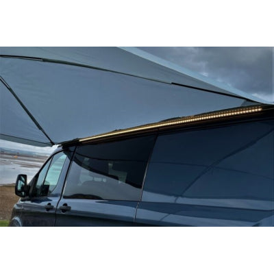 This new Design Registered product should prove popular with campers and touring campervans alike. Function with a stylish finish and straight forward to install. The kit comes with comprehensive fitting instructions. The led light is a particularly useful addition, casting a strong warm light underneath your awning, perfect for easily finding your way around your awning once the sun has set. Even without an awning attached the light strip is great for casting a cosy light onto your outside seating areas. No more having to navigate outside your van with a head torch in the pitch black. Call Us Email Us