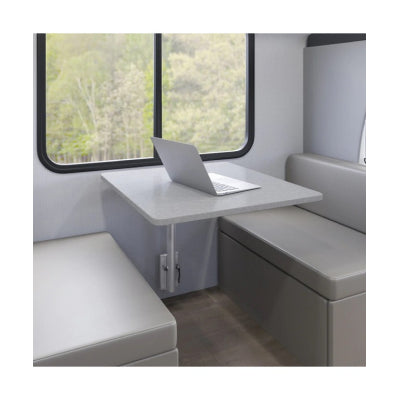 The leg is height adjustable with a 360° swivel to go from eating to working. The adjustment handles clamp like high-end bike seats so no turning of the handle and knock knuckles to tighten and hold the position.