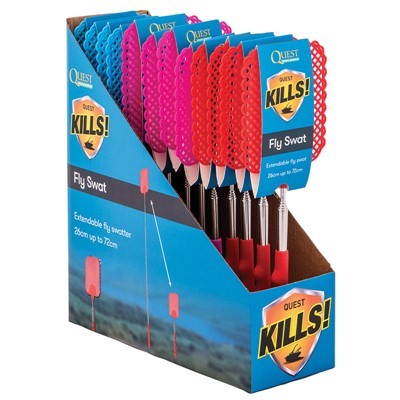 Quest Kills Extending Fly Swat Small, robust and deadly! This extending Fly Swat is perfect for everybody to help get rid of those pesky flies in the summertime. Available in a variety of colours to make sure there is always one to match your surroundings. Call Us Email Us