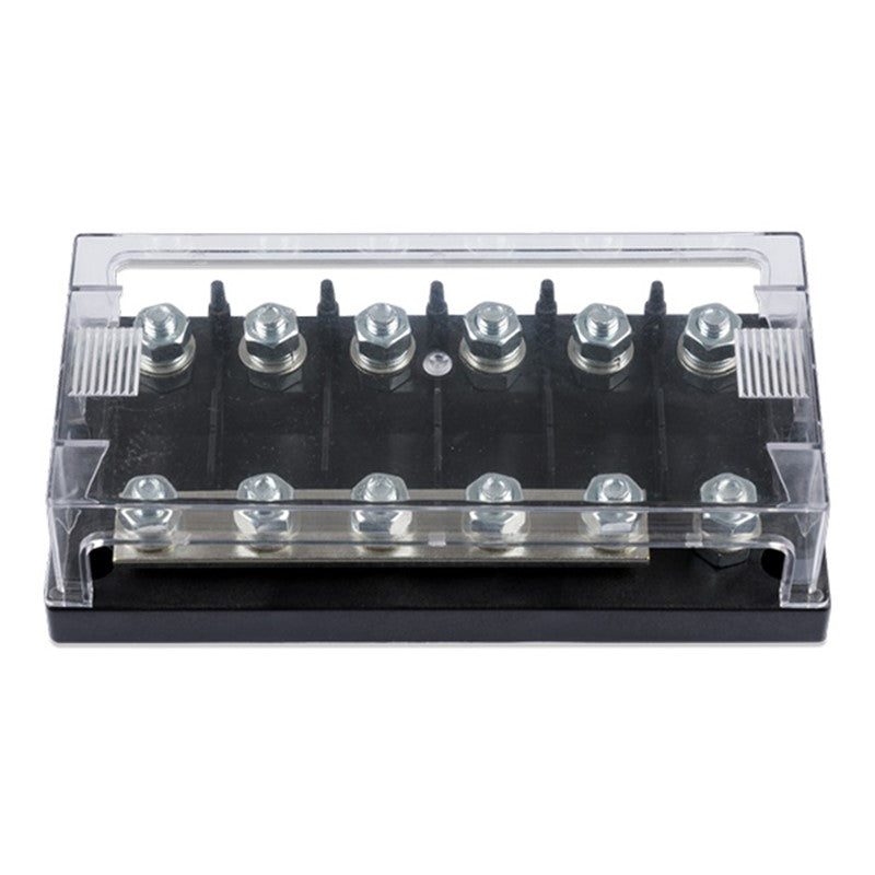 The Victron Six-Way MEGA-Fuse Holder with Integrated Busbar is a high-capacity fuse distribution system designed to hold up to six MEGA-fuses in one compact and organized unit. Ideal for advanced off-grid, marine, and automotive power systems, this unit includes a 250A-rated common busbar for simplified wiring and improved efficiency. Built for professional installations, it ensures safe and reliable high-current DC distribution across multiple circuits.