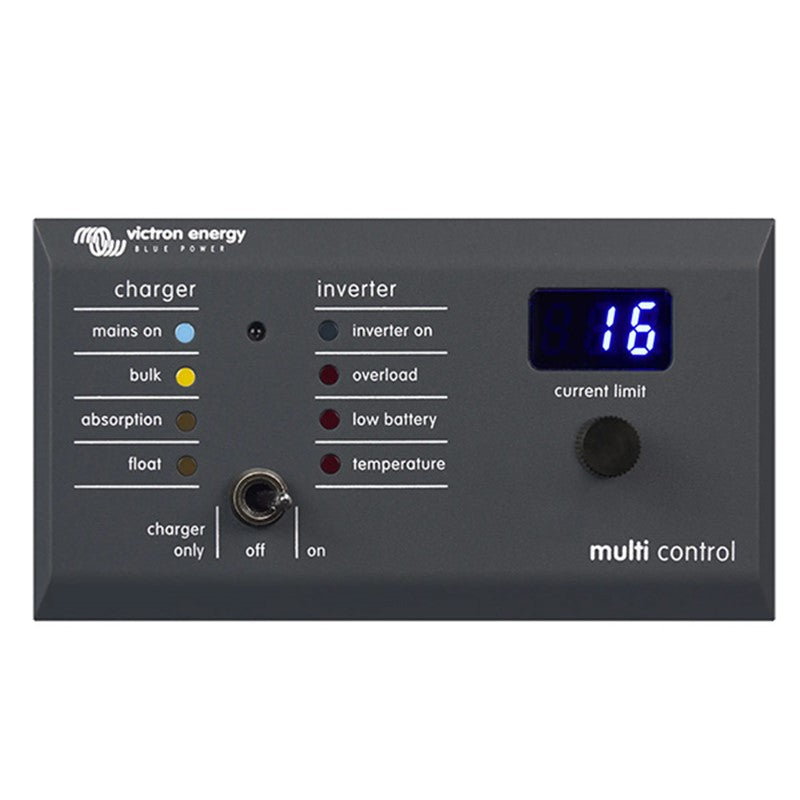 The Victron Digital Multi Control 200/200A GX is a wall-mountable remote control panel designed for use with Victron MultiPlus and Quattro inverter/chargers. It enables easy monitoring and adjustment of inverter settings from a convenient location, making it ideal for marine, off-grid, and vehicle installations. This model comes with a right-angle RJ45 connector, allowing for tidy cable management in compact spaces. Supplied in full retail packaging, it's perfect for installation professionals or resale environments.