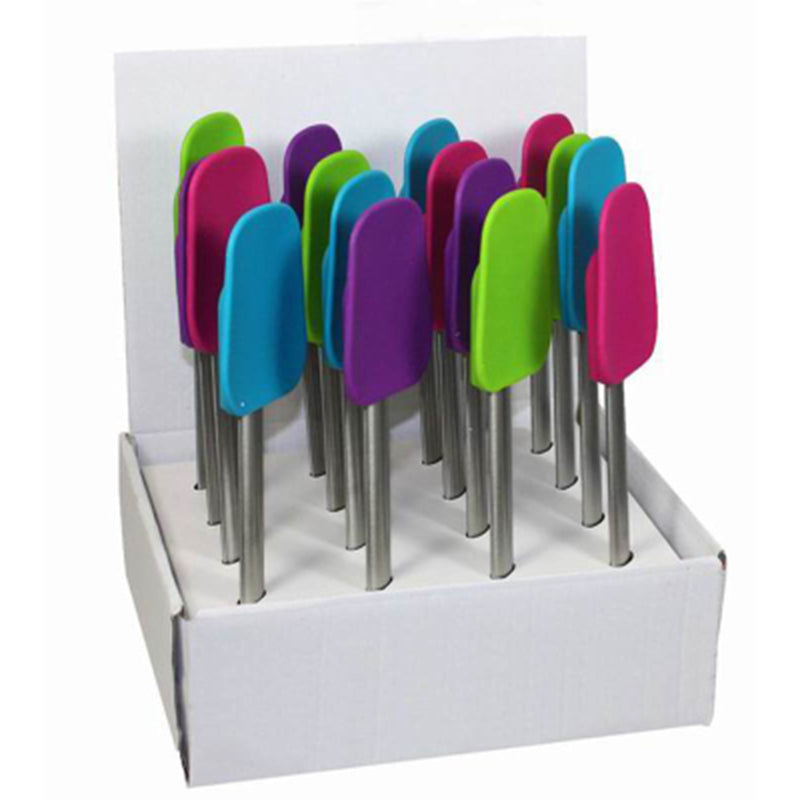 Silicone spoon with stainless steel tube handle outer quantity of 16 in a retail display box.